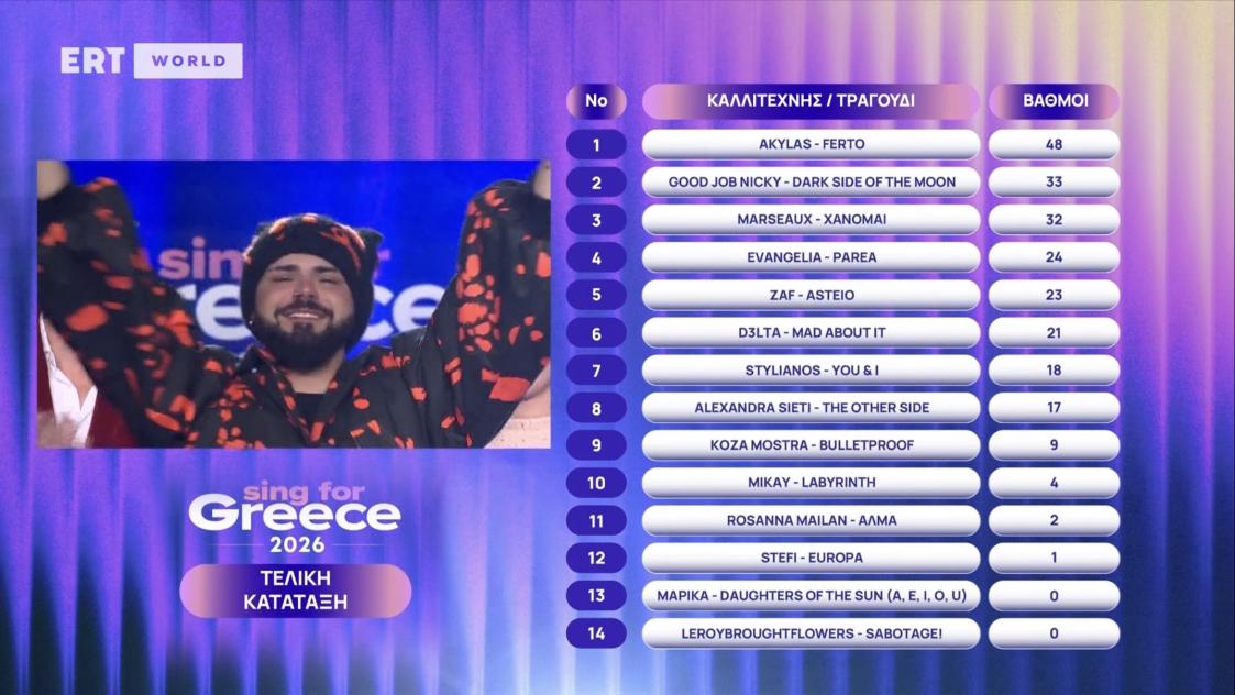 Akylas с песента „Ferto“ е победителят в големия финал на „Sing for Greece 2026“, с което получи възможността да представи южната ни съседка Гърция на „Евровизия 2026“ във Виена през май. Akylas получи 12 точки от международното жури, 12 точки от гръцкото жури и най-много точки от вота на зрителите. Така той събра общо 48 точки. Големият победител беше избран чрез комбинация от вот на публиката (50%), както и от две журита - едно гръцко (25%) и едно международно (25%), съобщава ERTnews. След победата Akylas заяви: